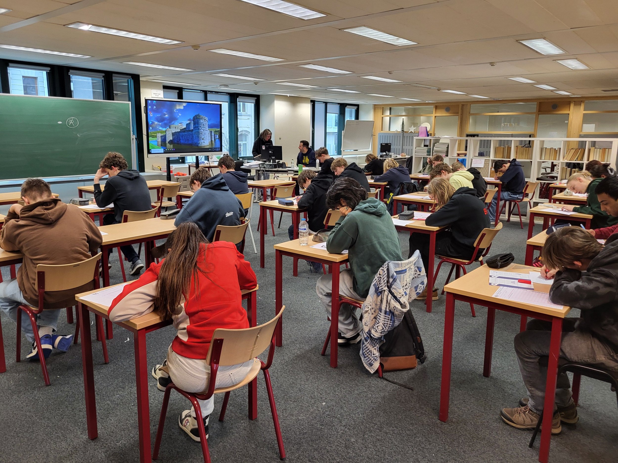 Gisteren namen 21 enthousiaste leerlingen deel aan de eerste ronde van de Wiskundeolympiade op onze school. Het was mooi om te zien hoe gedreven ze aan de uitdagende vraagstukken werkten — de concentratie en motivatie in het lokaal waren opvallend groot.